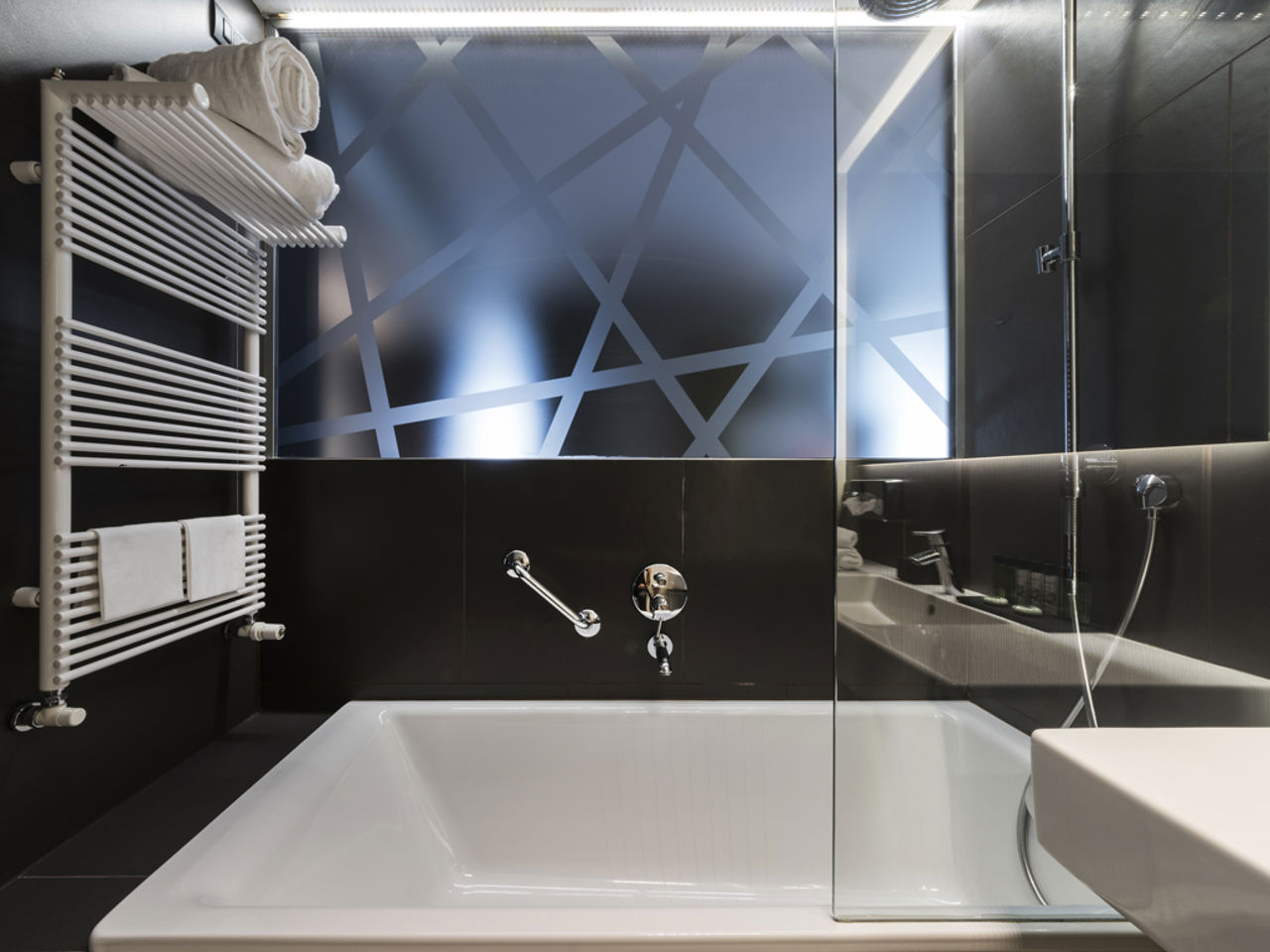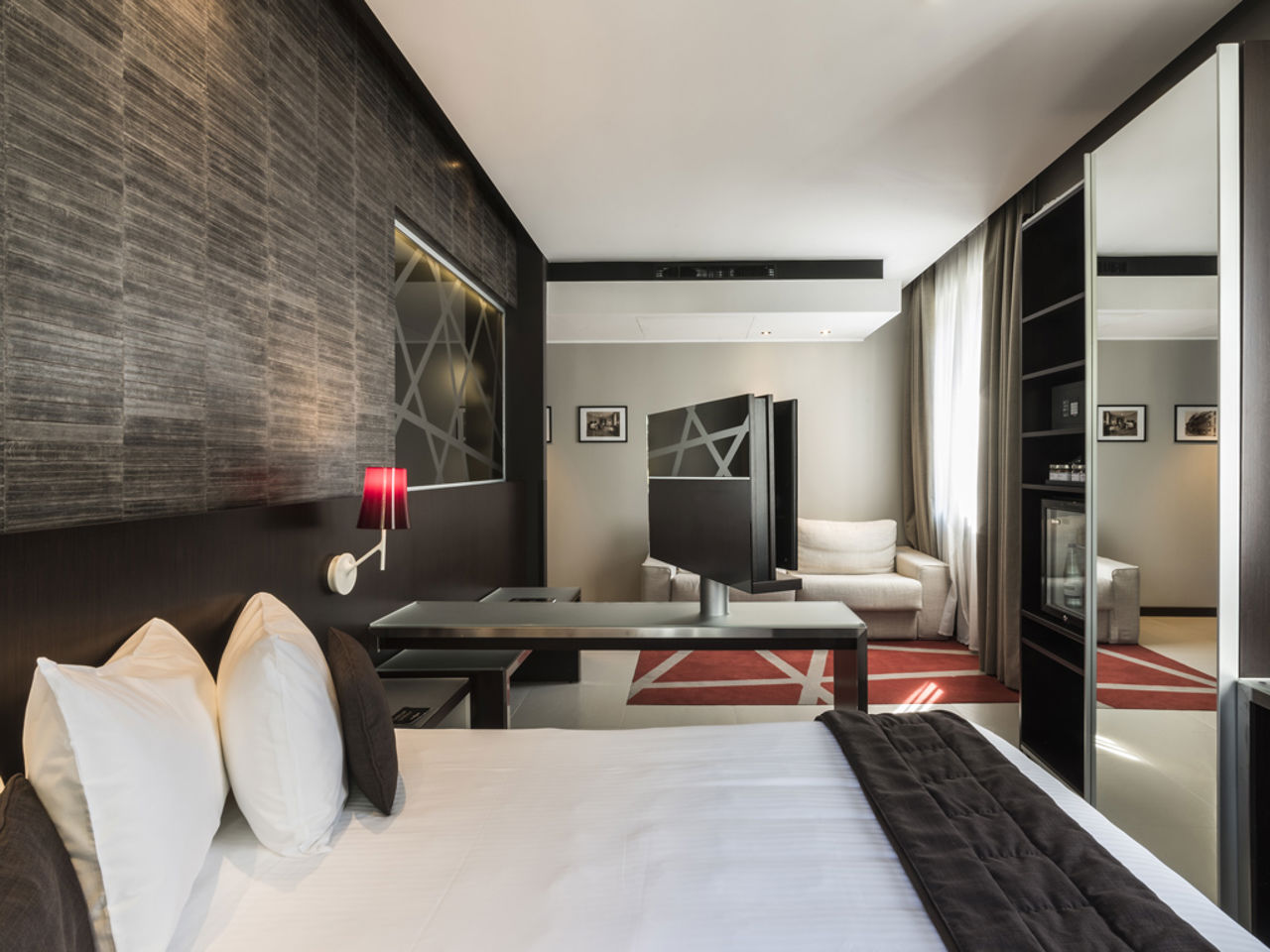 All rooms are soundproofed and equipped with: lava stone bathroom with comfortable porcelain sink, bathtub with shower, bathrobes and slippers, high-voltage hairdryer, make-up mirror, courtesy line based on plant extracts, large desk suitable for those who need to work on their laptop, free mineral water, minibar, Wi-Fi connection, 43" LCD satellite TV, combination safe, and extra-comfort mattresses.